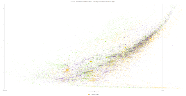 DeleteAt the end of the day, I need to choose a set of settings which are reasonably representative of each codec, otherwise the graphs just get insane. At the end of the day, users are going to select a single setting (usually they just go "max compression" - assuming that setting doesn't take insanely long to compress) and run with it. Perhaps these open source codecs should explicitly offer a setting that intelligently balances compression against decompression throughput.