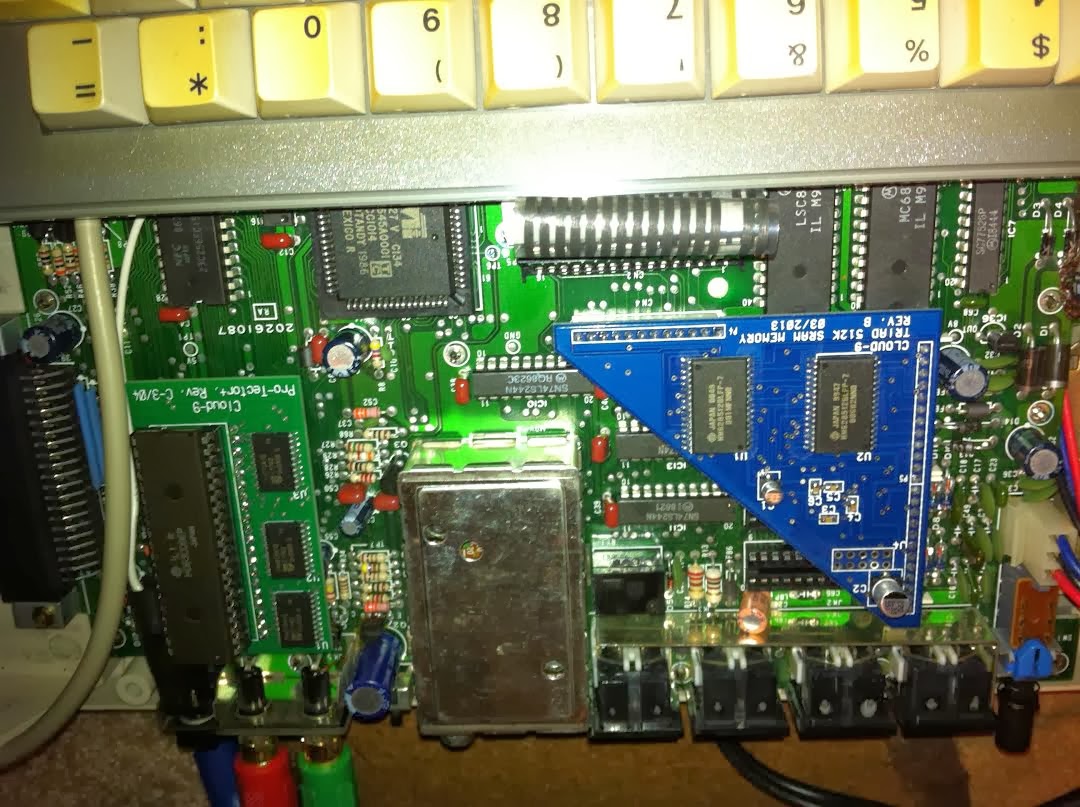 - The Cloud-9 512K Triad upgrade board (the blue triangle) was trivial to install by comparison. Following the instructions, I removed the four old (128K) RAM chips, snipped a couple capacitors, and plugged it in: