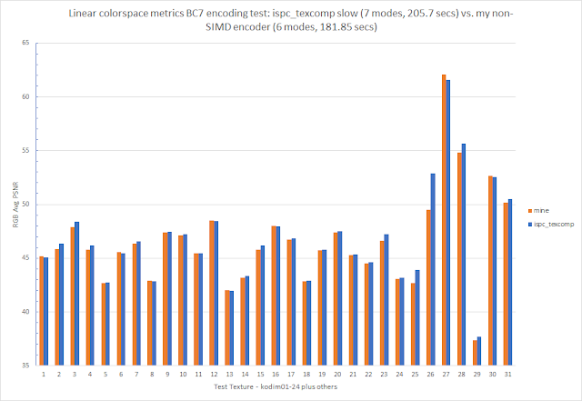 Here's the REC 709 luma PSNR of 31 test textures encoded with ispc_texcomp (slow/highest quality - uses 7 modes) and my non-SIMD encoder in perceptual mode using just 4 modes:
