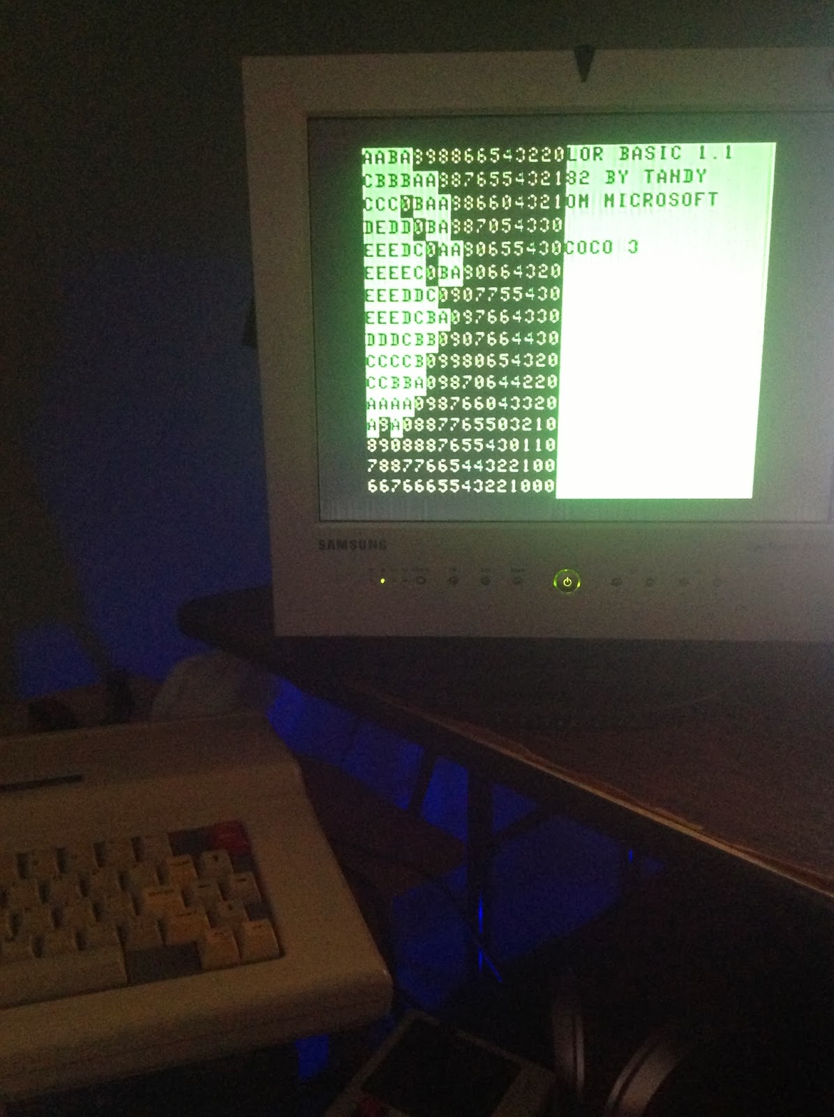 Unfortunately, I can't run it again without restarting the machine and booting up DriveWire again -- no idea why yet. If I hit reset and EXEC the decoder again it does something but the output image is bogus. This process is terribly slow because after restarting the machine I must CLOADM the DriveWire 4 client over the cassette port (hooked up to my PC's sound output). The DriveWire booting process uses Winamp to play back the cassette sound file!