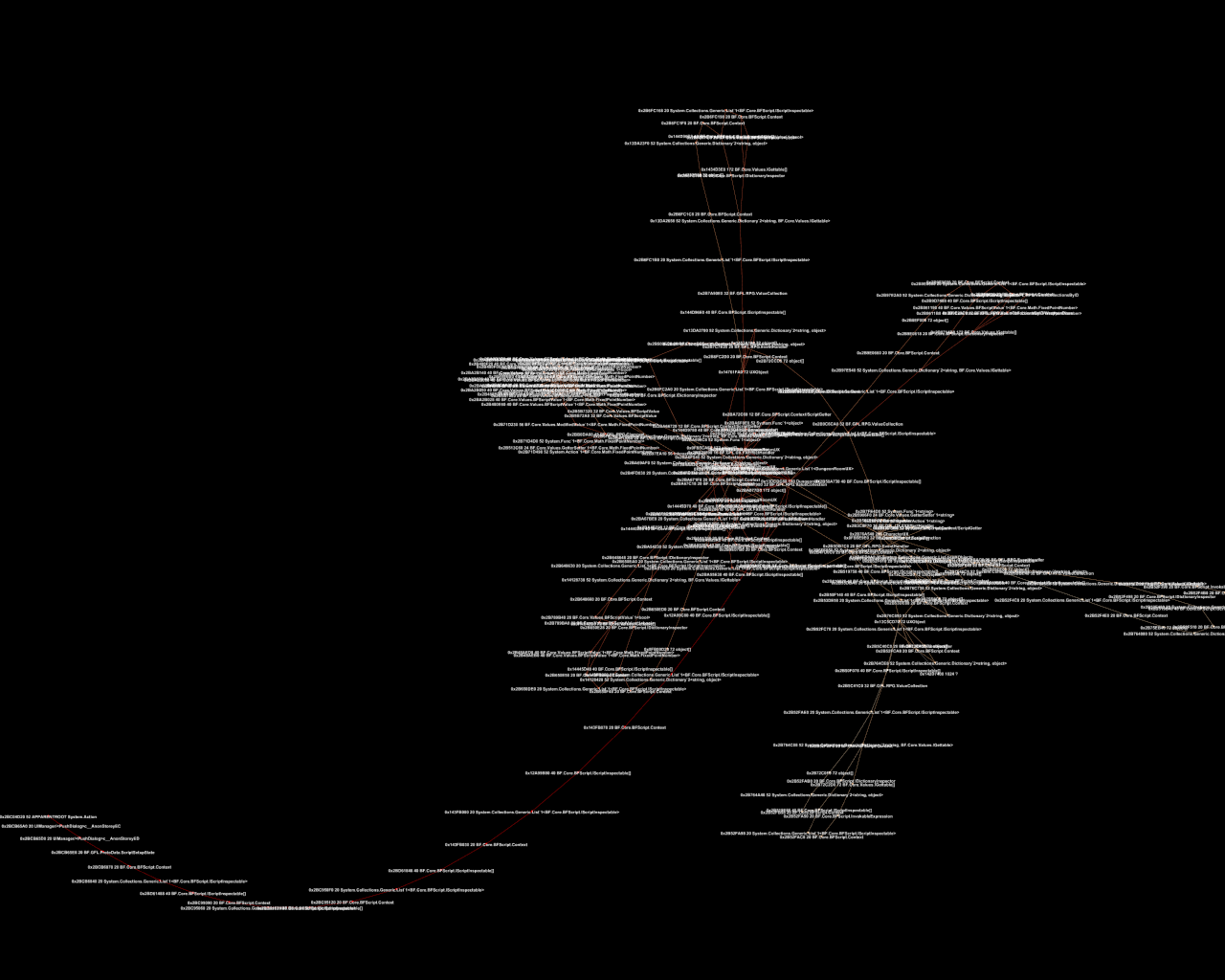 To build this graph, we recorded a heap transaction log and post-GC memory snapshots of our product running a single dungeon and exiting to the game's menu. I then played back this transaction log with our analysis tool ("HeapBoss") and stopped playing back the log right after the dungeon was exited. I had the tool start building the graph at a single ScriptableUXObject object on the heap (instances of this type are leaking after each dungeon). The tool then found all references to this object recursively, up to any roots and exported the graph to a .dot file. Gephi is used to visualize the graph, using the Yifan Hu algorithm to optimize the layout.