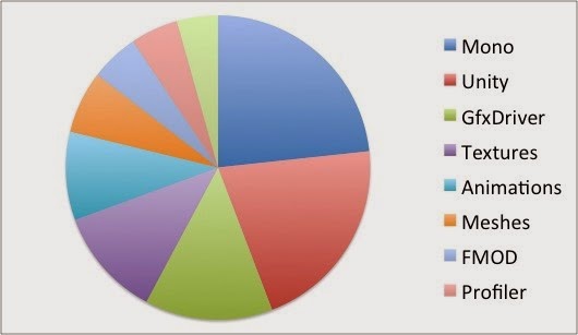 A snapshot of our current memory footprint on iOS, using Unity's built-in memory profiling tool (thanks to Sean Cooper):