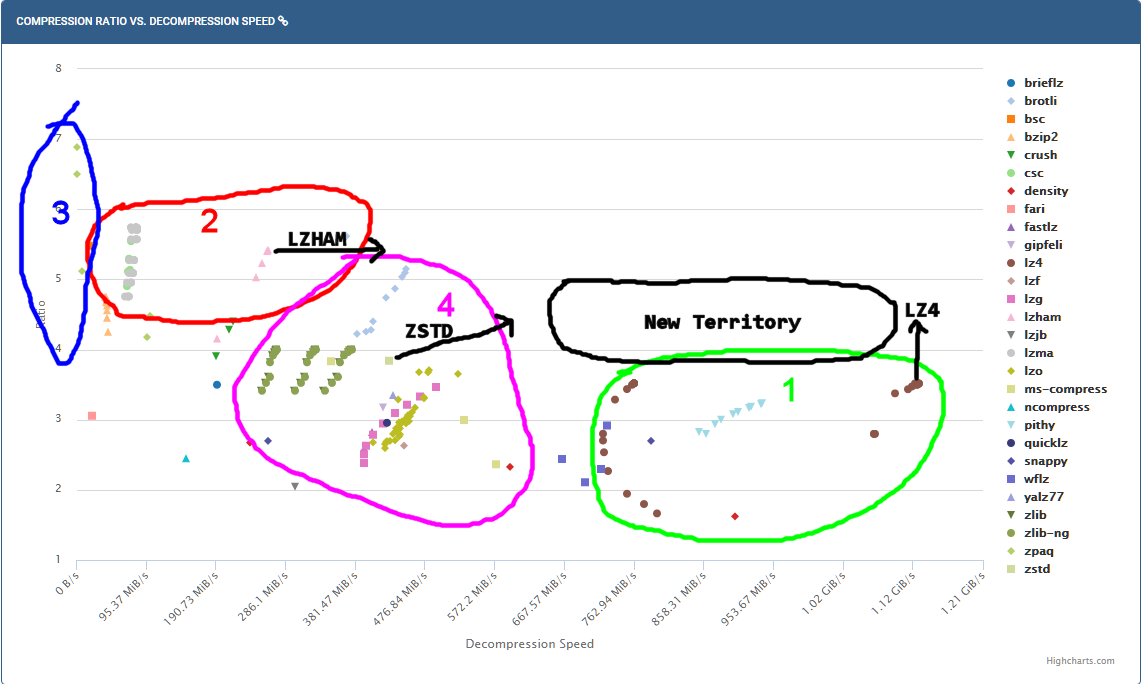 Note the circle is rough. I tried to roughly match Brotli's ratio in region 4, but it could go higher to be closer to LZMA/LZHAM.