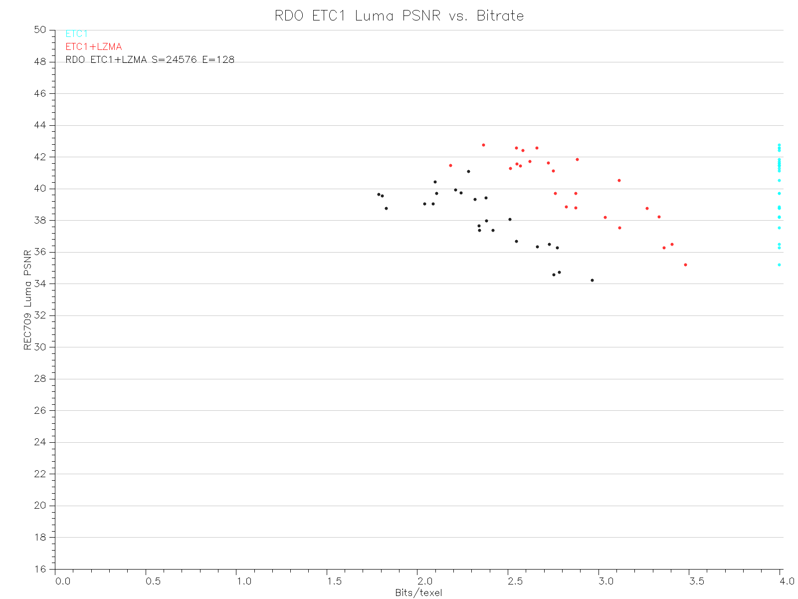 The next graphs are just like the previous ones, except the adaptive subblock feature is disabled. They show that RDO ETC1 with no quantization is virtually identical to basic (highest quality, block by block) ETC1 compression.